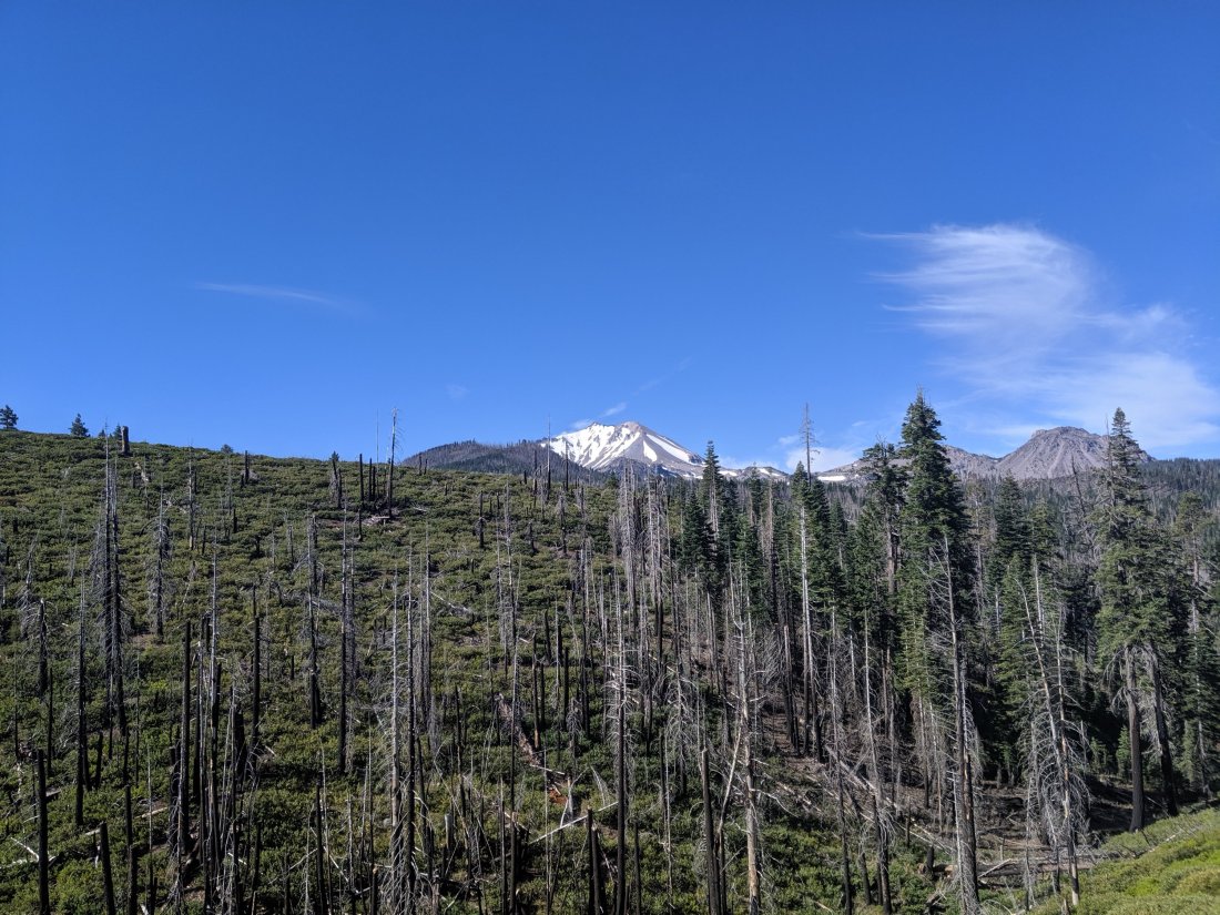 First, since leaving Donner Pass, the Sierras have gradually mellowed and died out as I moved north. While far from the largest, at c. 10,500 feet, Mt Lassen is the southernmost volcano of the Cascade range, where I will be for the remainder of the hike, and whose super-prominent volcanoes will dominate the landscape (as I write this, I’m already in the shadow of Mt Shasta, which, at 14,200 ft, is the second highest Cascade volcano, after Mt Rainier). It’s a nice psychological boost to move into a new range, and to be able to measure progress visually by which volcanoes are visible at any point.