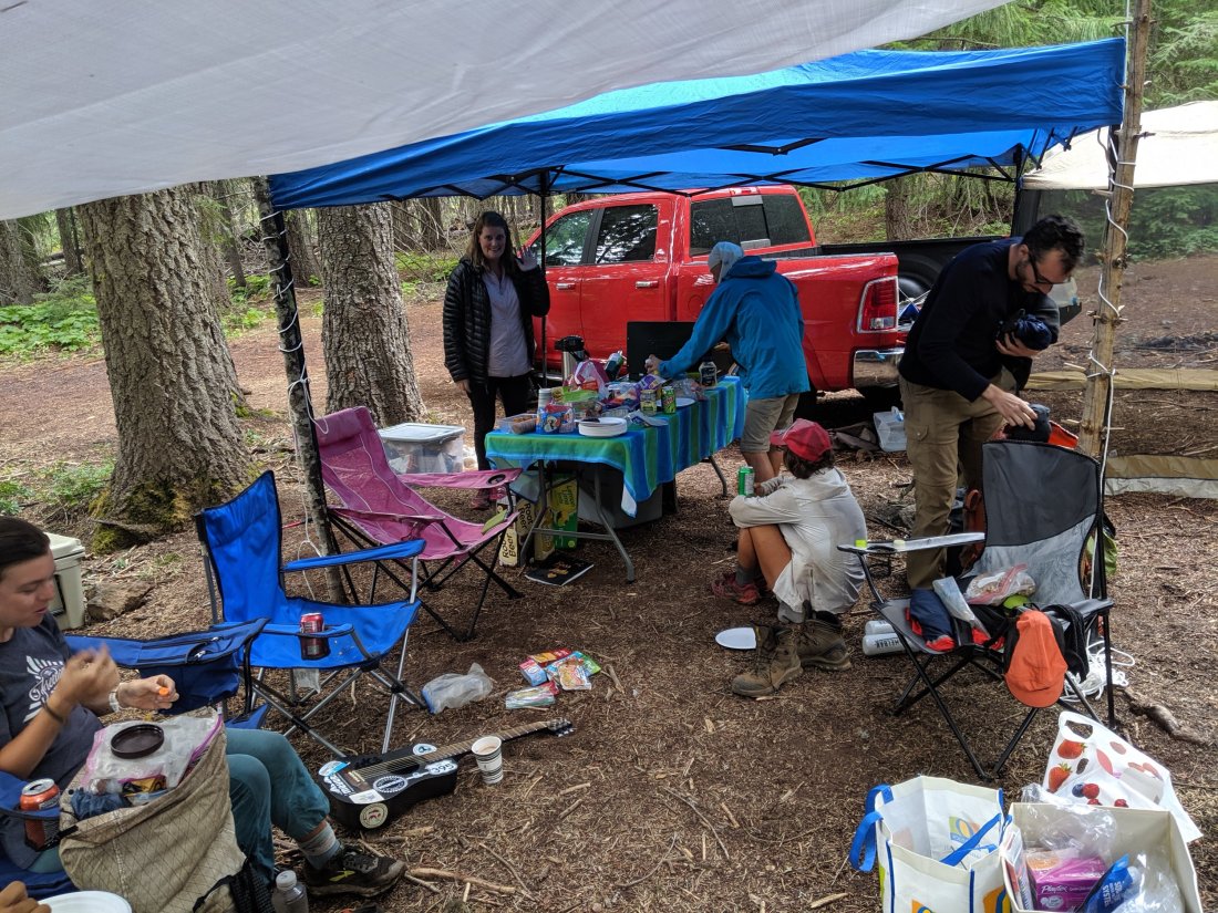 Second, a rainstorm rolled through starting in the early afternoon. Fortunately, at the spot where we were aiming for lunch, a lovely woman named Clementine had set up a trail magic station. She was staying a week in a town nearby where her husband was for work, and decided to spend her days helping out hikers, having hiked sections of the PCT herself. She had awnings, a grill with hot dogs, tons of snacks, and a charging station. Because it was raining and because Étienne was basically dead from doing 1.5 30-mile days, we stayed for a couple hours, relaxed, treated Étienne’s blisters, etc.