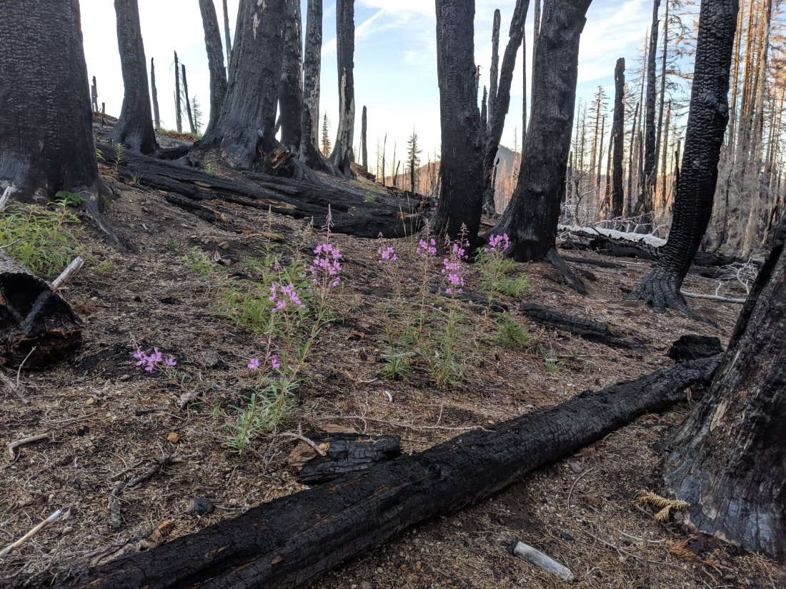Day 107 took us to just south of Crater Lake. Most of the hiking was back in the green tunnel, but good water sources were still few and far between. We passed through some burn areas near the end of the day which I found quite striking, because they were devoid of life save for some brilliant pink flowers popping up between the charred tree trunks.