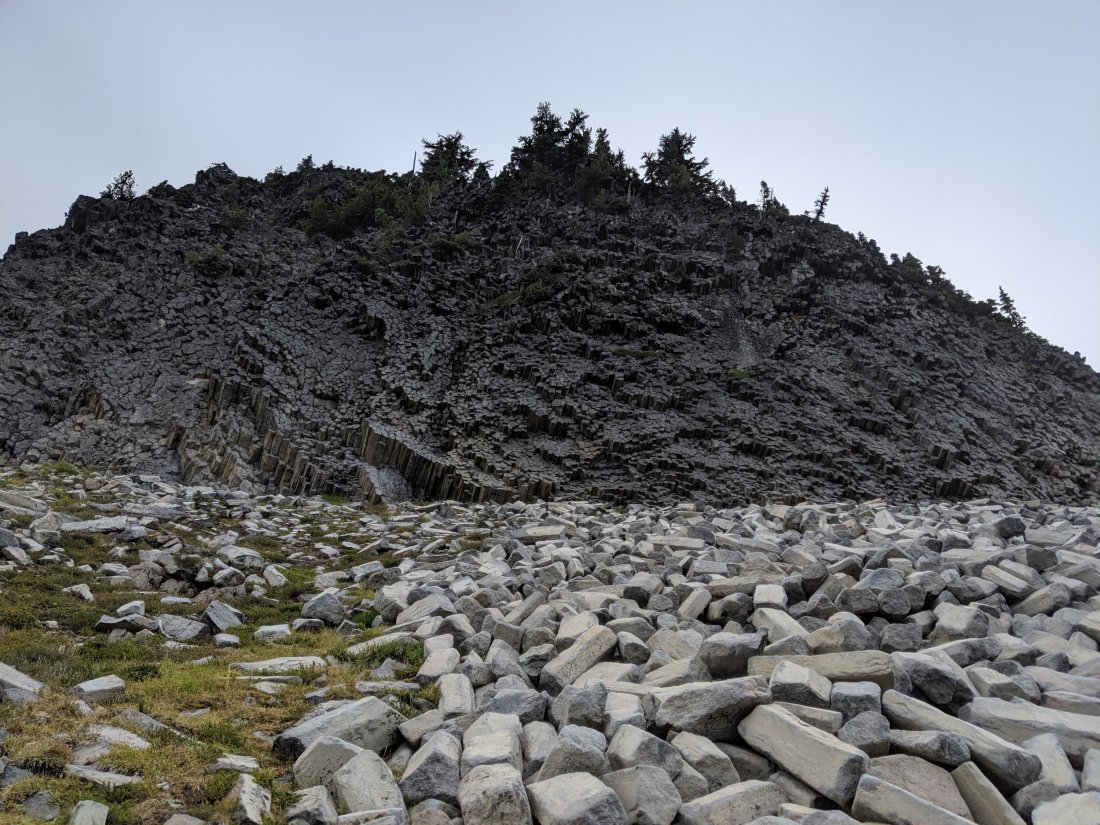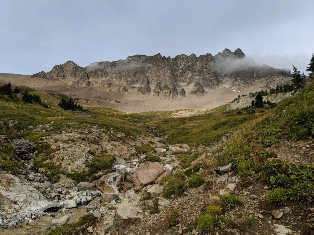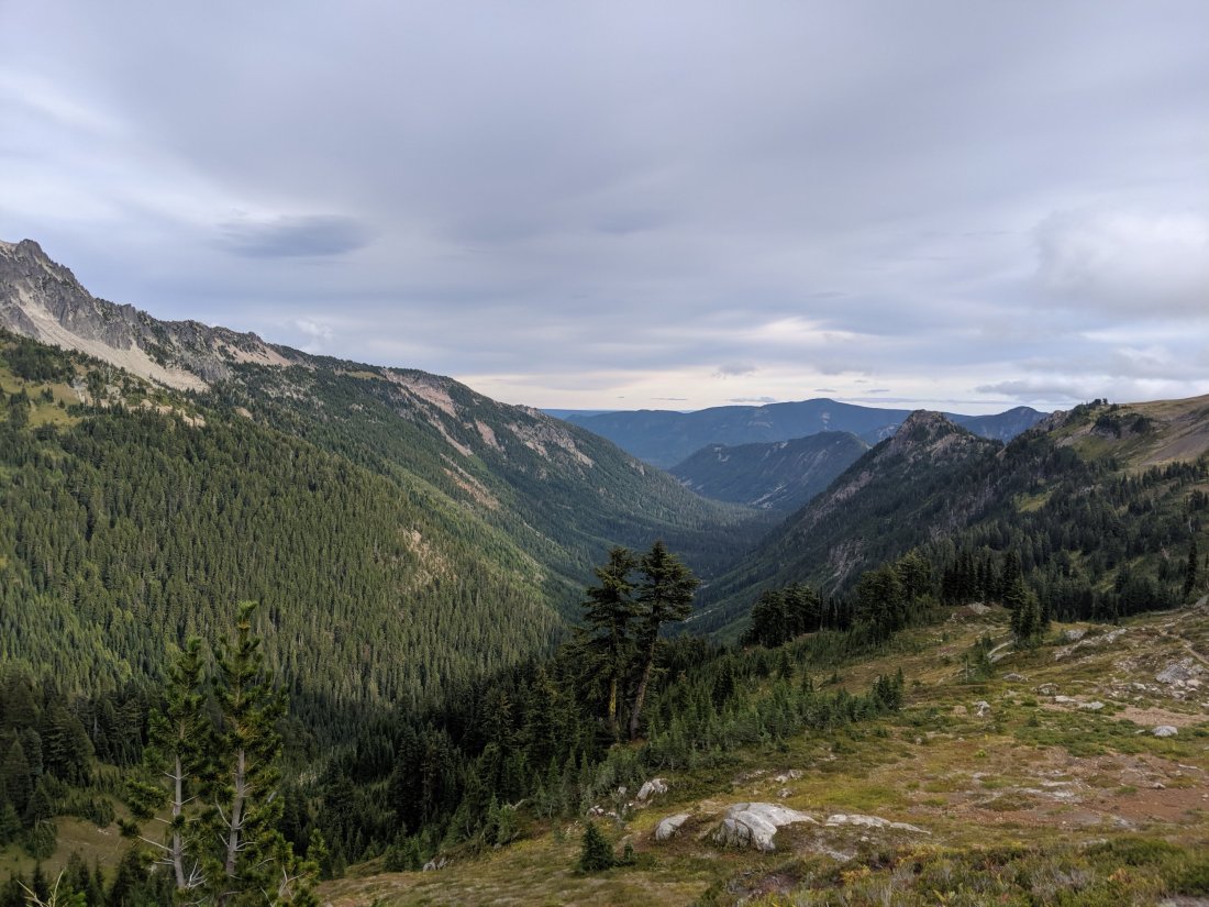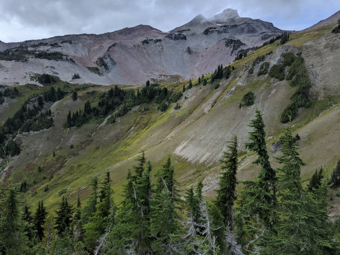 Goat Rocks is apparently an extinct volcano which has eroded into several smaller jagged peaks and ridges, and is named for the mountain goats which roam the area (I didn’t see any – they may have been out of season). As a result of this process, the scenery is much more jagged and dramatic than the relatively low elevation (<8,000 feet) would suggest. On a day with good weather, as I had finishing the region on Day 130, there are stunning views of the formation itself, as well as out to Mts Adams, Rainier, and St Helens (of 1980 eruption fame). With the addition of large volcanoes in the background and vast evergreen forests down below, it all kind of reminded me of the most dramatic sections of the Scottish Highlands (e.g. the Black Cuillin in Skye), with huge grassy slopes topped with imposing dark cliffs.